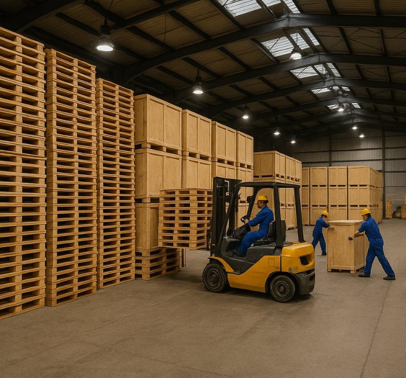 Pallet e caixas de madeira ideais para movimentação interna e organização de estoque em lojas e centros de distribuição.